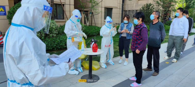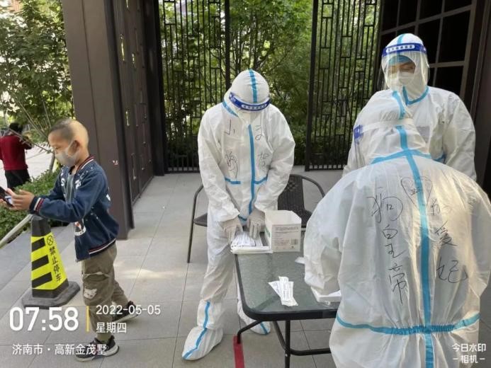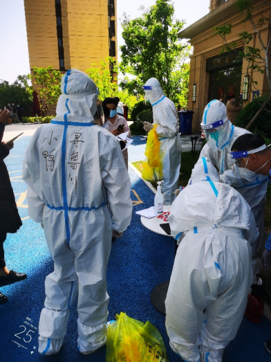 由于一直在高溫下“全副武裝”,志愿者的防護(hù)服早已被汗水浸濕,手掌被泡得發(fā)白,臉上也被口罩勒出了痕跡,更有志愿者出現(xiàn)了頭暈、流鼻血等中暑癥狀。盡管如此,他們也是稍加休整,便再次沖鋒向前。休息時間,志愿者們席地而坐,匆匆吃完奔赴崗位,因忙碌而錯過飯點(diǎn)更是常事,然而他們卻從未有過怨言;腰肌勞損、椎間盤不好的團(tuán)隊(duì)干部即使腰疼的直不起來,也依舊抵擋不住他助力抗疫的熱情與行動。……小鴨志愿者尋魯川在協(xié)助核酸檢測時,有一個小男孩很不配合,由于當(dāng)天的核酸檢測并沒有貼紙,男孩媽媽便偷偷準(zhǔn)備了小貼畫,拜托尋魯川給小朋友貼上。尋魯川很感動,并且樂意幫忙,尋魯川說:“他兩只大眼睛直勾勾的盯著貼紙看,特別萌,心都被萌化了,真是開心了一整天,所有的疲憊都一掃而空。” …… 在抗“疫”前線,小鴨人和社區(qū)居民們互相理解,互相配合,如此令人感動又暖心的事跡不勝枚舉。
